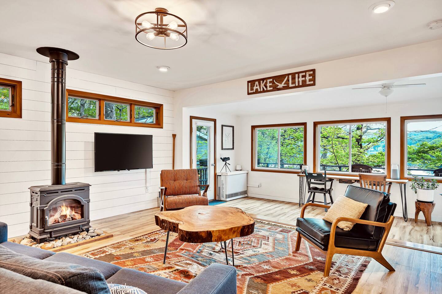 - Well behaved dogs are welcome (limit 2, we are unable to accommodate pit bulls, Doberman pinschers and Rottweilers due to insurance stipulations). - We are unable to accommodate cats because of a family member’s allergy. - There are six steps to get from the driveway to the house. - There are two flights of stairs to get from the deck to the waterfront. - The living area of the house is all on one level. - The bedroom is small and cozy. - The driveway and lakefront have security cameras facing away from the house which are turned on when the house is unoccupied. Feel free to chat with us if you have questions that are not covered in the description that you might need answered before booking.